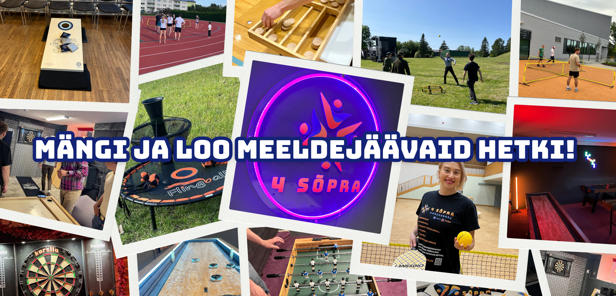 tuues kokku inimesed läbi mängude ja liikumise. Korraldame mitmekesiseid üritusi sõpradele, firmadele, koolidele ja teistele seltskondadele – nii siseruumides kui ka vabas õhus. Lisaks saad broneerida ka privaatse mänguruumi, mis on ideaalne väiksematele gruppidele – sünnipäevad, tiimiüritused või lihtsalt üks lõbus õhtu!